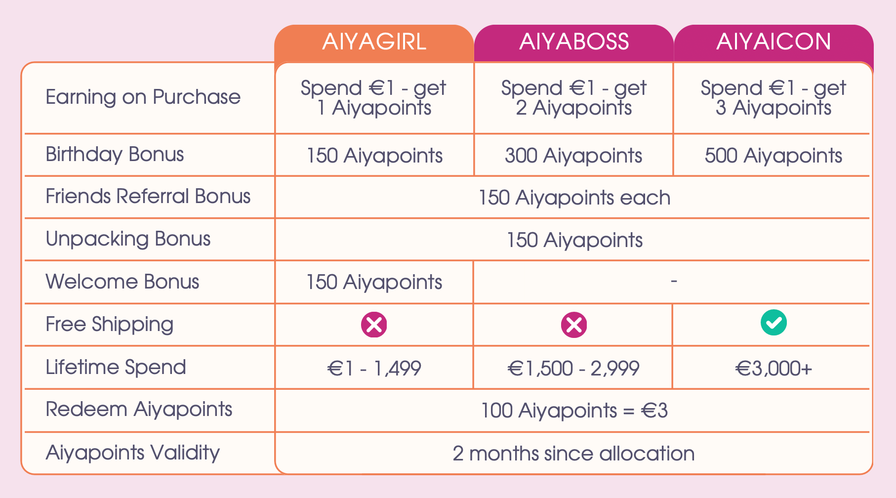 AIYALOVE loyalty program turns every purchase into Aiyapoints that multiply as you level up—double, triple. Plus bonus rewards for Insta unboxing vibes, friend invites, and access to exclusive drops & events 🩷 Join AIYALOVE for an instant Welcome bonus!